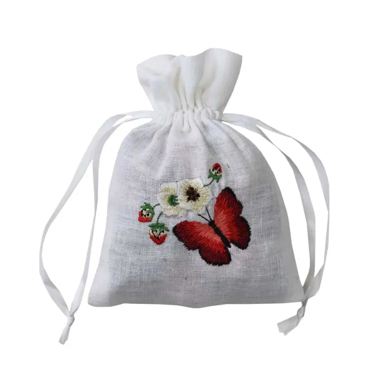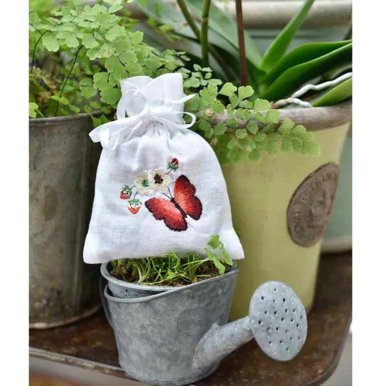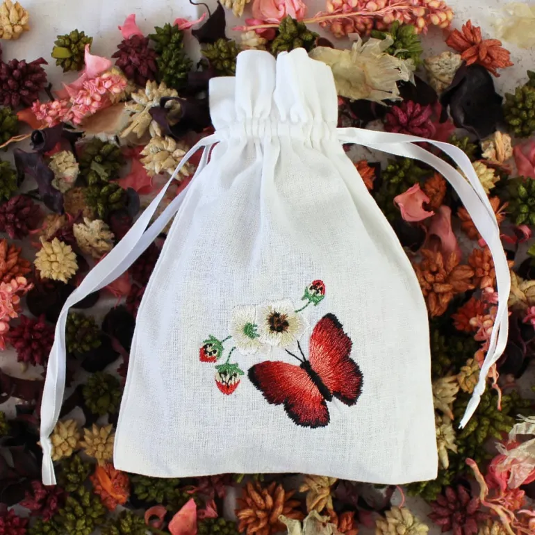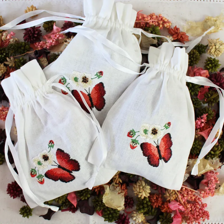 Prachtigwitkatoenen zakjemet trekkoord, dichtgebonden met wit lint en geborduurd met een rode vlinder, wilde aardbeien en bloesem. Perfect om in kledingkasten te hangen, in lades te stoppen of onder kussens te leggen, zodat de delicate geur je huis aangenaam zal parfumeren. Ze zijn gevuld met potpourri die heerlijk ruikt!